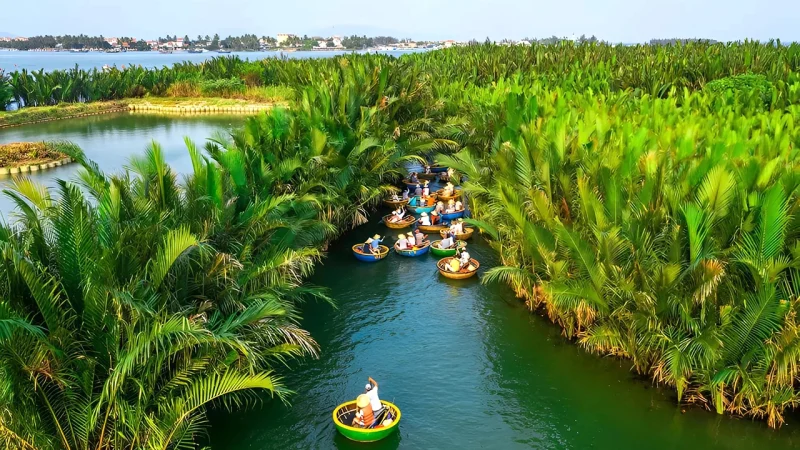 Enjoy a peaceful basket boat ride through the lush waterways of the Cam Thanh Coconut Jungle, where you can watch local fishermen and learn about their daily life. Surrounded by green palms and tranquil canals, it’s a refreshing escape into Hoi An’s countryside charm.